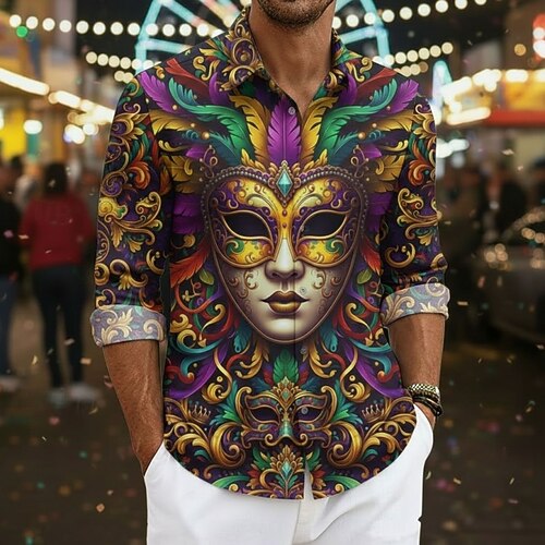Carnevale Per uomo Grafico Maschera con piume Camicia Camicia button-down Camicia da Spiaggia Manica Lunga Hawaiano Casual Confortevole Vacanza Ferie Martedì grasso Estate Primavera Collo ripiegato