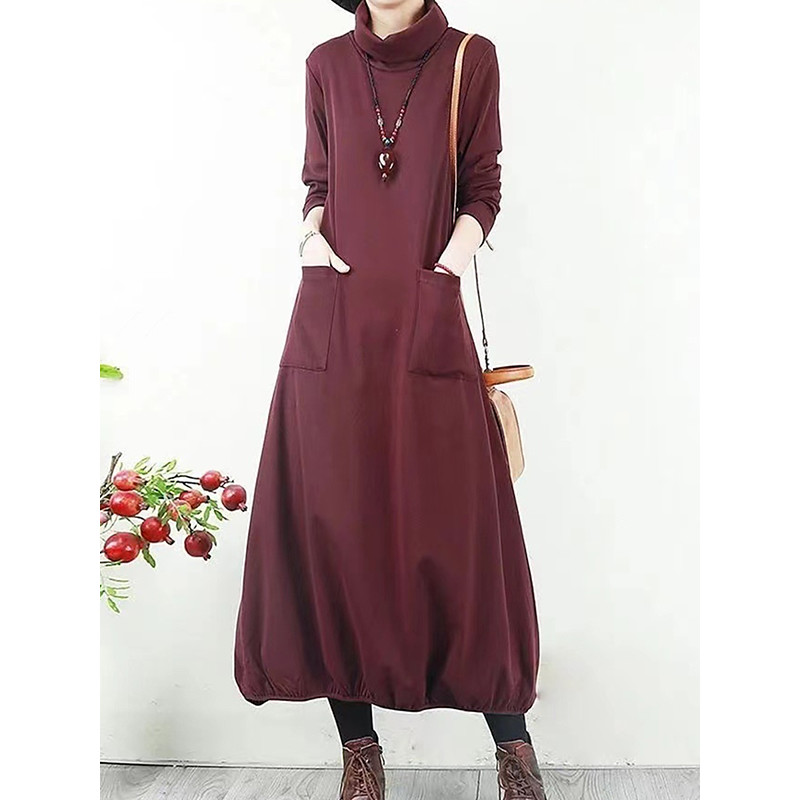 Women's Black Dress Long Dress Maxi Dress Polyester Ruched Pocket Daily Date Active Fashion Turtleneck Long Sleeve Black Wine Khaki Color
