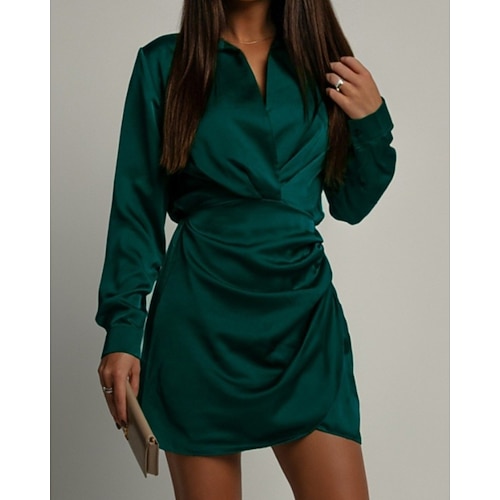 Per donna Mini Abito Abito in Raso Abito Camicia Abito arricciato Moderno Quotidiano Uscire Weekend Vestibilità regolare Semplice Manica Lunga Colletto a Camicia Nero Verde scuro Marrone Rosso rosa