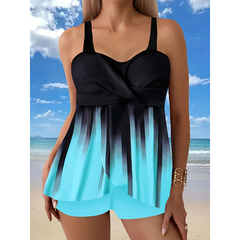 Women's Tankini 2 Piece Swimsuit Shorts Tummy Control High Waist Slim Backless Vacation Beach Wear Ombre Striped V Neck Sleeveless Bathing Suits