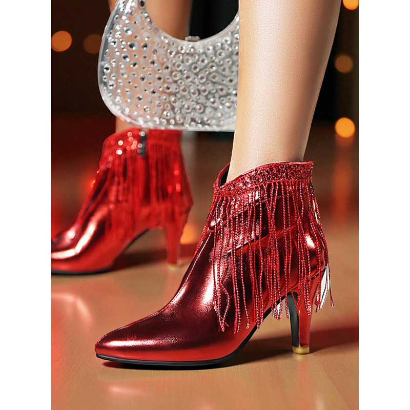 Women's Red Metallic Fringe Ankle Boots - Sparkly Pointed Toe Party Heeled Booties for Dance, Evening and Cocktail Events