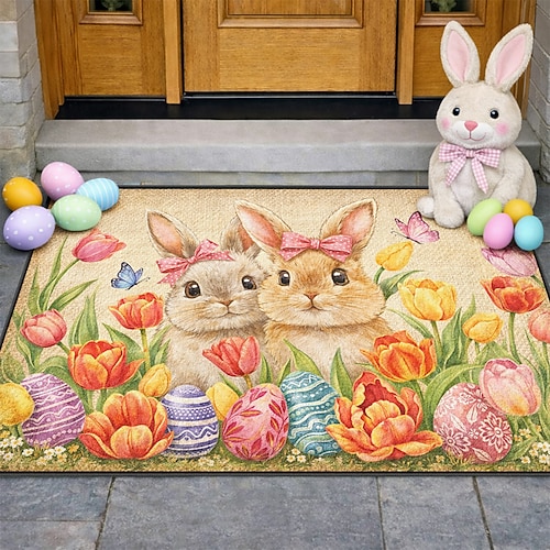 Oster-Fußmatte mit Hasenpärchen und rosa Schleifen, umgeben von leuchtenden Tulpen und Deko-Eiern – die perfekte festliche Frühlings-Willkommensdekoration.