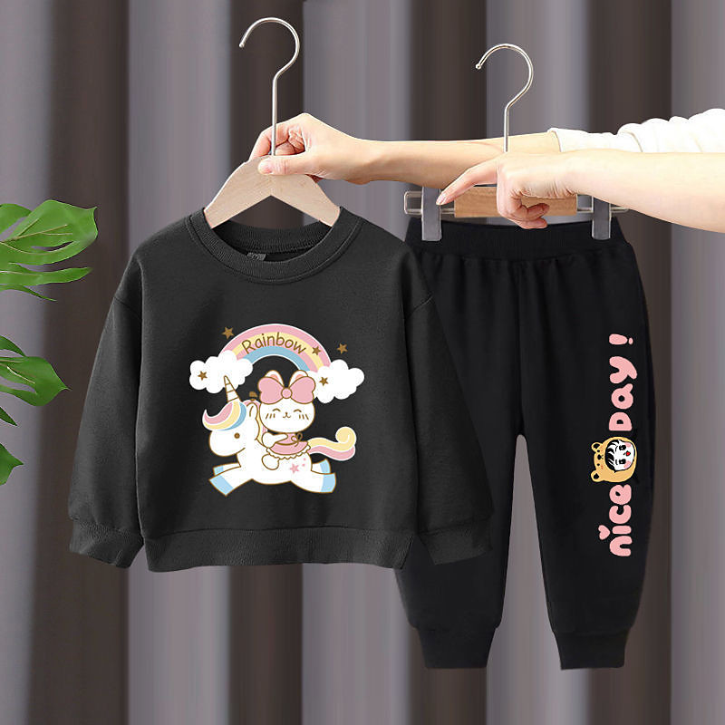 2 Pieces Kids Girls' Rainbow Crewneck Hoodie Sweatpants Set Set Long Sleeve Active Outdoor Cotton 3-7 Years Spring Black unicorn sweater nice black pants Black unicorn sweater nice gray pants