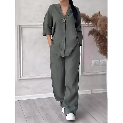 Per donna Set ispirati al lino Set da due pezzi Maglietta Pantaloni a Gamba Larga Manica Lunga Tinta unica Nero Blu Cachi Primavera Vestibilità regolare