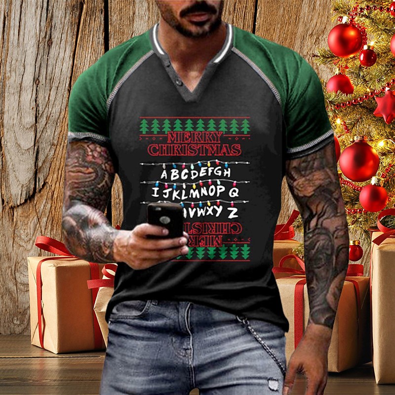 Christmas T Shirt Men's T shirt Tee Color Block Letter Graphic Prints V Neck Green 3D Print Outdoor Christmas Short Sleeve Patchwork Button-Down Clothing Apparel Sports Designer Casual /
