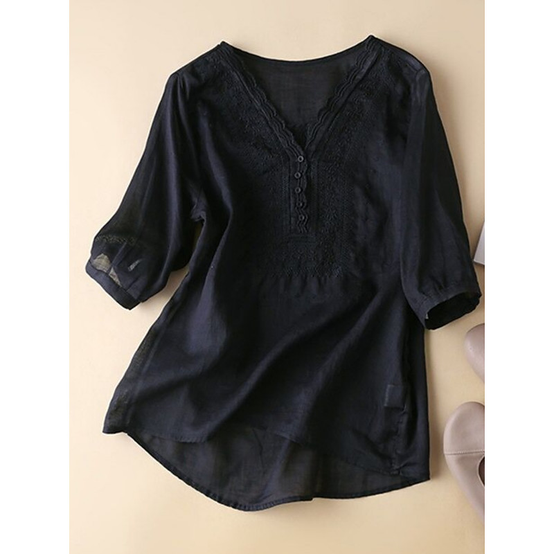 Women's Cotton Linen Shirts Solid Color Stylish Casual 3/4 Length Sleeve V Neck Regular Tops Daily Lace Patchwork Black White Wine Navy Blue Summer Spring