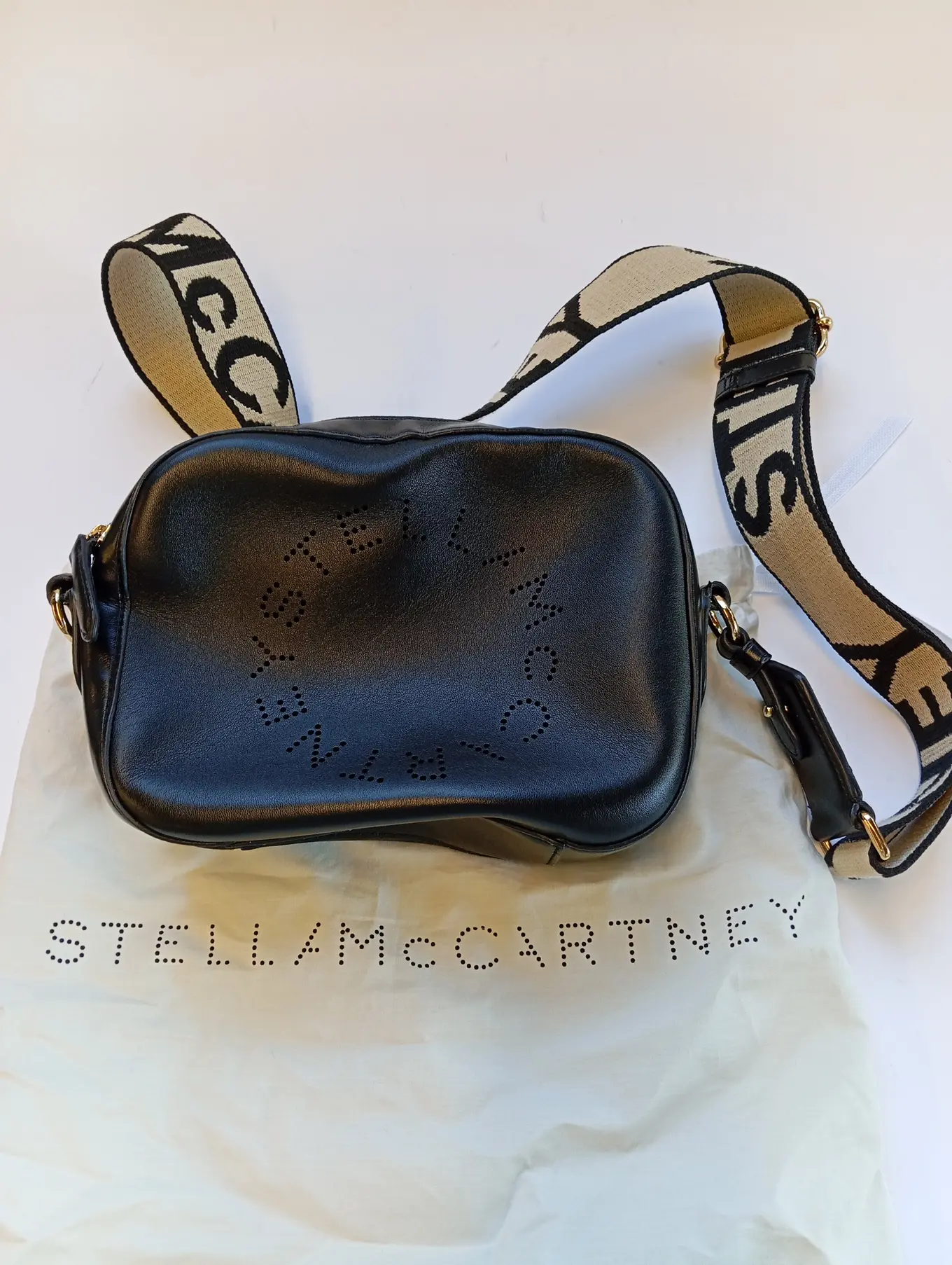STELLA MCCARTNEY Small Logo Crossbody Bag - Schwarze Leder Umhängetasche mit Golddetails