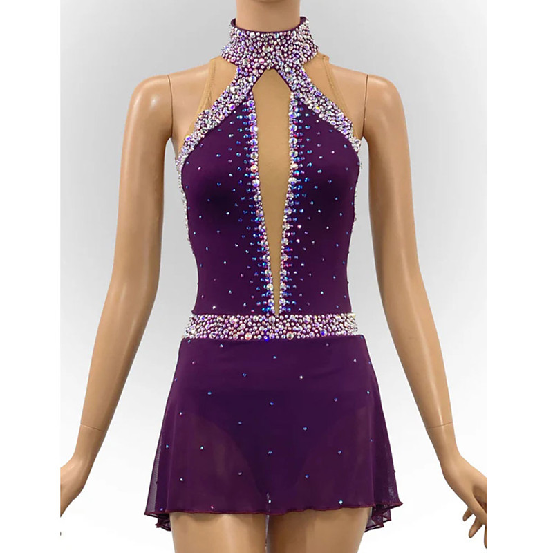 Figure Skating Dress Women's Girls' Ice Skating Dress Purple Open Back Asymmetric Hem Mesh High Elasticity Training Competition Skating Wear Classic Crystal / Rhinestone Sleeveless Ice Skating Figure