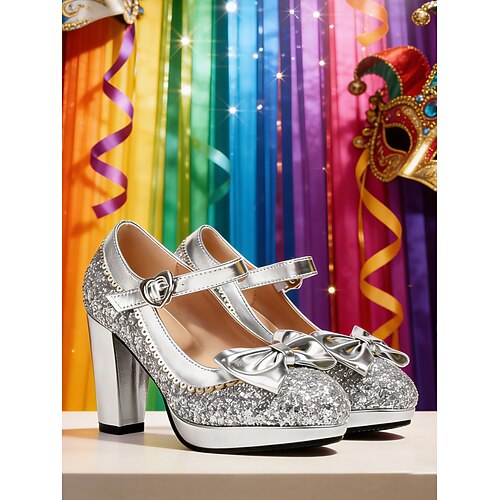 Décolleté Mary Jane dorati con glitter per donne del Mardi Gras con dettaglio a fiocco – pumps scintillanti stile glamour retro perfetti per carnevale e celebrazioni festive