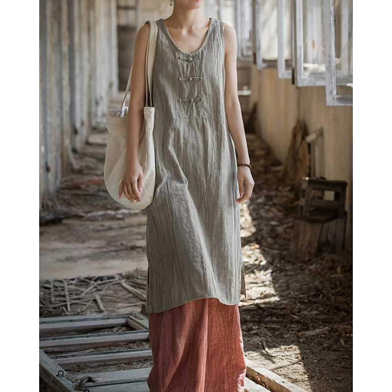 Women's Midi Dress Cotton Linen Dress Vintage Daily Outdoor Vacation Loose Fit Plain Sleeveless V Neck Light Yellow Light Purple Green Grey Summer Spring
