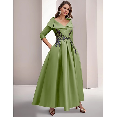 Linea ad A Asimmetrico Lunghezza alla caviglia Vestito da Festa Abito da Cocktail Abito da invitata a nozze Abito da cerimonia per signora Manica 3/4 Scollo a V Elegante Vintage Formale Raso