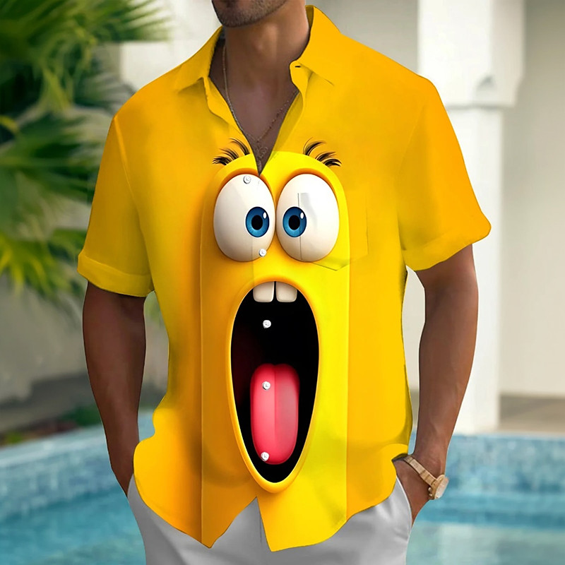 Men's Optical Illusion 3D Cartoon Smile Face Shirt Summer Shirt Button Up Shirt Short Sleeve Funny Streetwear Holiday Summer Spring Turndown 3D Print Collared Shirts Front One Pocket Yellow