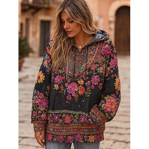 Felpa con cappuccio da donna vichinga boho, con stampa floreale, casual, boho, a maniche lunghe, con cappuccio, regular top, street, patchwork, tasca frontale, nera, primavera, autunno, inverno