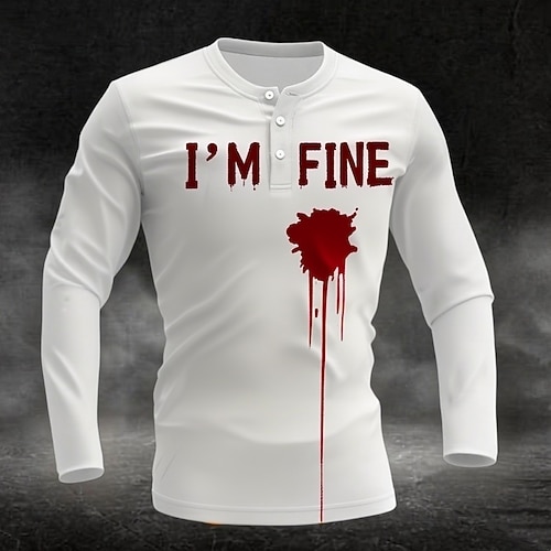 Maglietta Uomini Macchie di Sangue Divertente I'M FINE Henley Camicia a Maniche Lunghe Fashion Carina Quotidiana Casual Festa Autunno Primavera e Autunno Bianca Henley Henley T-Shirt