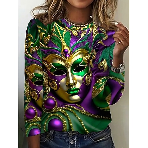 Maglietta da donna Carnival Graphic Fashion Casual a maniche lunghe colletto rotondo top regolari stampa quotidiana fine settimana blu nero viola estate primavera autunno