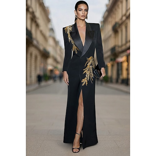Abito blazer Black Tie Abito smoking applicazione in paillettes oro Ospite di matrimonio formale crepe satin stretch elegante spacco alto manica lunga colletto a punta in satin