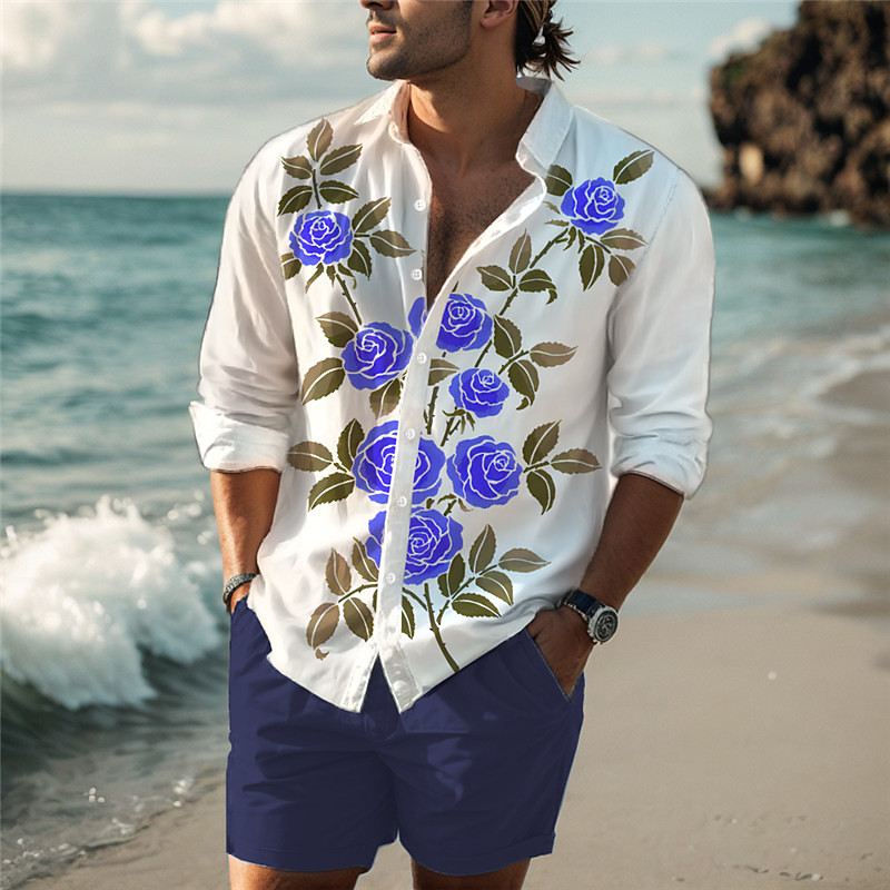 Valentine's Day Rose Casual Men's Shirt Daily Wear Going out Weekend Fall Winter Standing Collar Long Sleeve Red, Blue, Purple S, M, L Slub