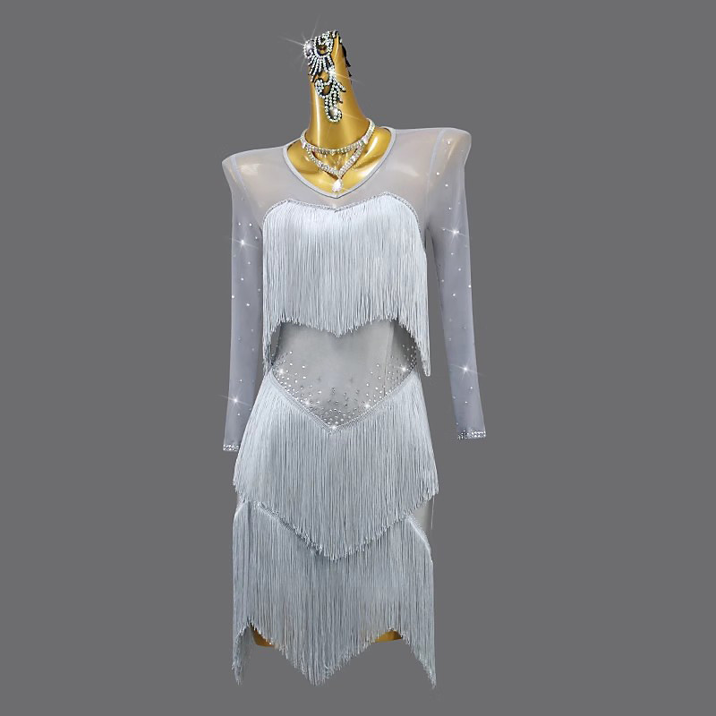 Latin Salsa Dance Dress Crystal / Rhinestone Tassel Splicing Women's Performance Party Long Sleeve Spandex