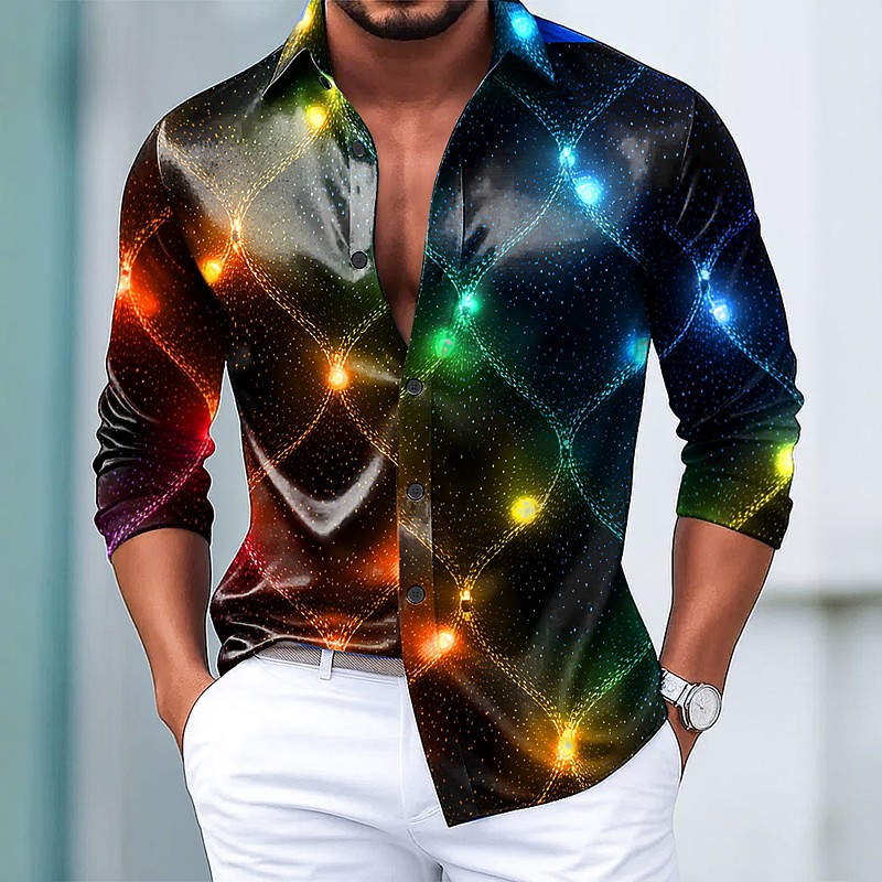 Christmas Men's Sparkling Glitter Gradient Color Christmas Light Shirt Satin Shirt Dress Shirt Long Sleeve Fashion Casual Party Holiday Summer Spring Fall Turndown 3D Print Button Up Shirts Black 1