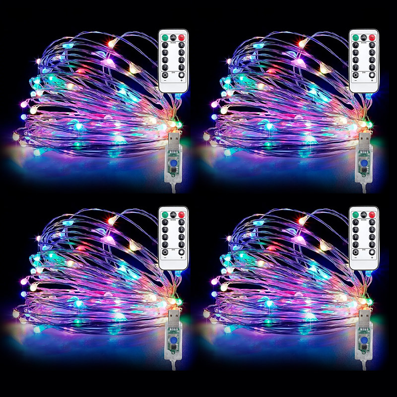4 Pcs 10M/33FT 100 LED Beams Fairy String Lights Halloween Christmas Valentine's Day Wedding Party Indoor and Outdoor Copper Wire Light String USB Plug in 8 Function Remote Control IP44 Waterproof