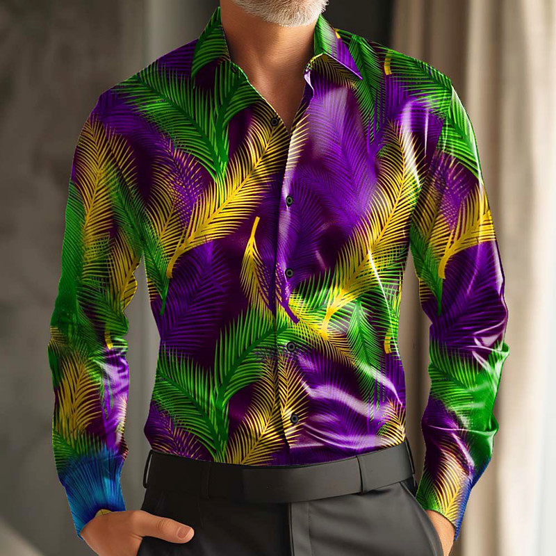 Mardi Gras Men's Feather Carnival Shirt Satin Shirt Dress Shirt Long Sleeve Fashion Casual Party Holiday Summer Spring Turndown 3D Print Button Up Shirts Purple Dark Purple