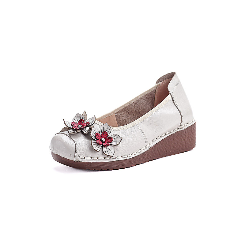 Women's Red Genuine Leather Floral Flats – Handmade Retro 3D Flower Comfortable Wedge Slip-On Shoes for Work Casual Wear
