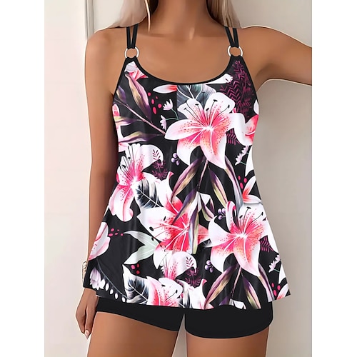 Tankini da donna costume da bagno a 2 pezzi pantaloncini controllo della pancia vita alta slim schiena scoperta abbigliamento da spiaggia per vacanze ombre floreale collo a U costumi da bagno senza