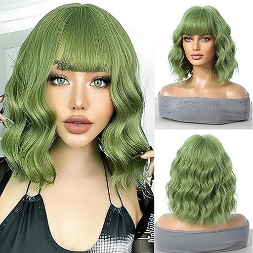 parrucca corta lunghezza spalle bob parrucca riccia ondulata con frangia per donna affascinante parrucche sintetiche resistenti al calore per appuntamento uso quotidiano