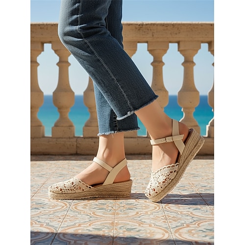 sandali con zeppa espadrillas beige boho all'uncinetto da donna: ideali per le vacanze estive, i resort sulla spiaggia e le gite informali