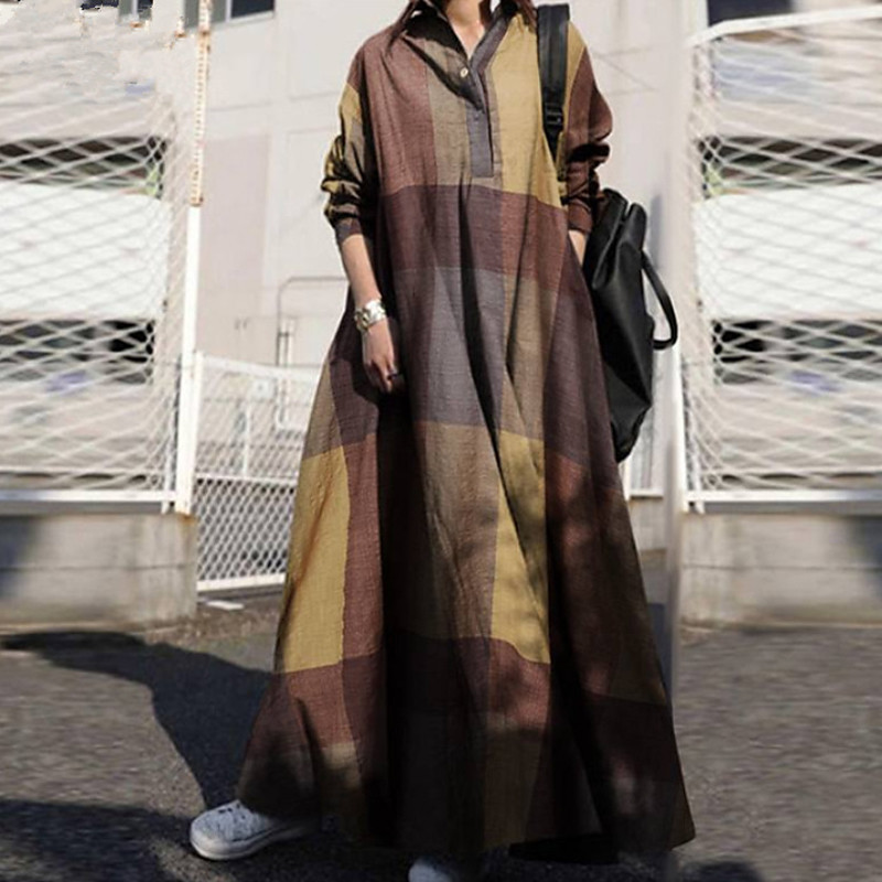 Women's Long Dress Maxi Dress Cotton Blend Swing Dress Fashion Modern Daily Going out Weekend Regular Fit Geometric Long Sleeve Shirt Collar Blue Yellow Red Summer