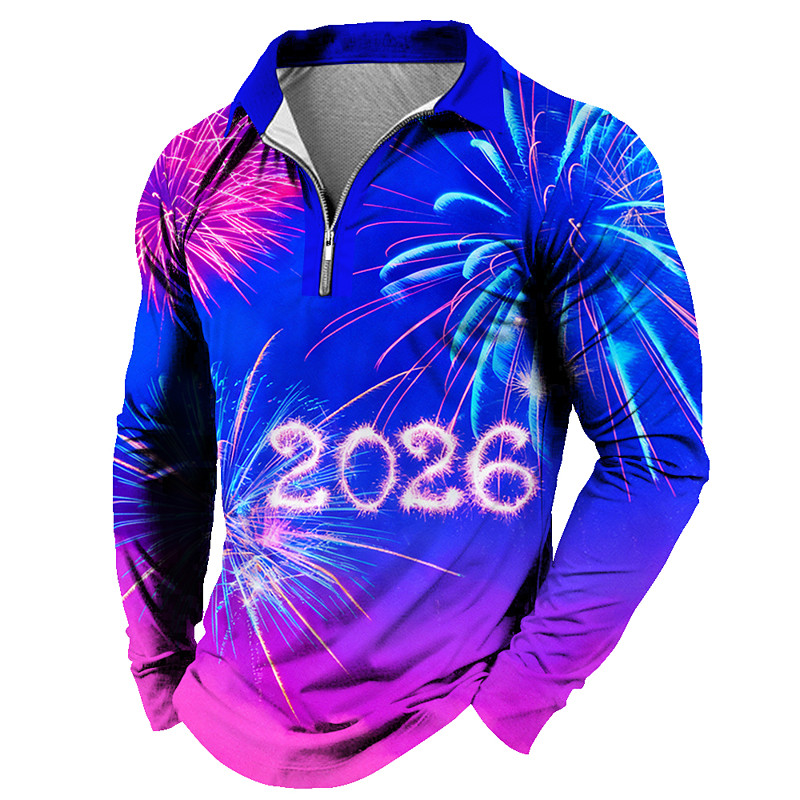 New Year Men's Fireworks Polo Long Sleeve Polo Shirts Lapel Casual Daily Wear Festival Outfit 3D Print Quarter Zip Polo Spring Fall Winter Blue Red Sky Blue