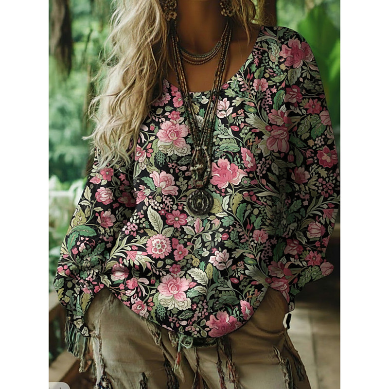 Women's Boho T-shirt T Shirt Tee Top Floral Vintage Ethnic Casual Long Sleeve Crew Neck Regular Tops Daily Weekend Vacation Wear Print Black Summer Spring Fall