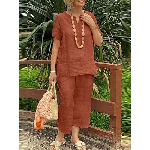 Per donna Set ispirati al lino Set da due pezzi Maglietta Pantaloni di Lino Manica Corta Tinta unica Bianco Arancione Verde Estate Vestibilità regolare