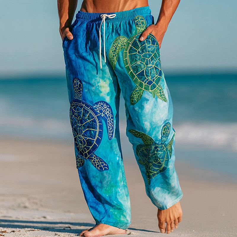 Men's Turtles Sea Creatures Trousers Baggy Pants Casual Pants Mid Waist Hawaiian Outdoor Vacation Beach Wear Elastic Drawstring Waist Linen-Like Pants with Pockets Summer Spring 3D Print Blue Sky