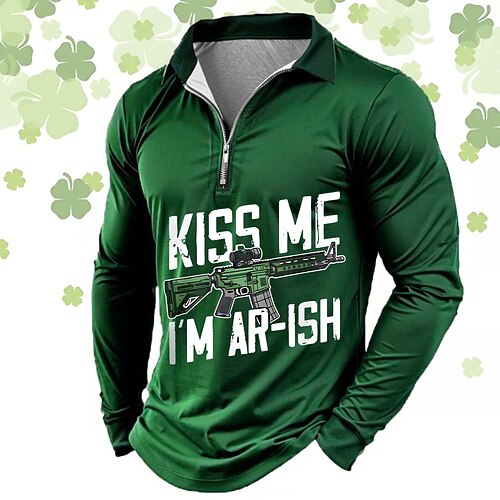 Giorno di San Patrizio Per uomo Testo Polo con zip Manica Lunga Magliette polo Bavero Casual All'aperto Abito da festa Stampa 3D Primavera Autunno Inverno Nero Verde chiaro Verde
