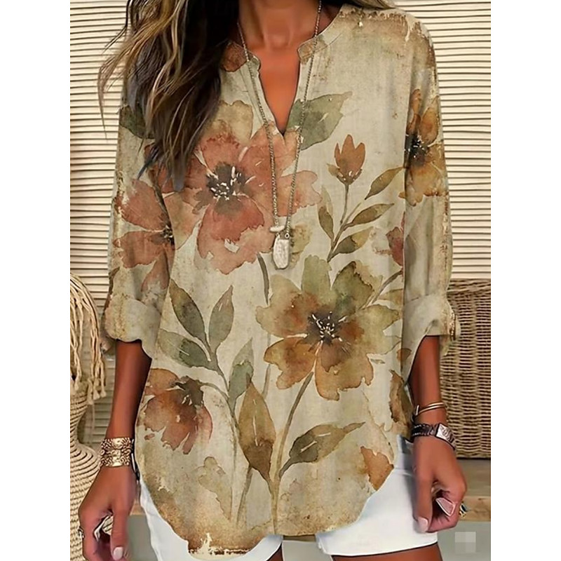 Women's Shirt Tunic Floral Graphic Bohemia Vintage Daily Long Sleeve V Neck Long Tops Daily Holiday Print Khaki Summer Spring