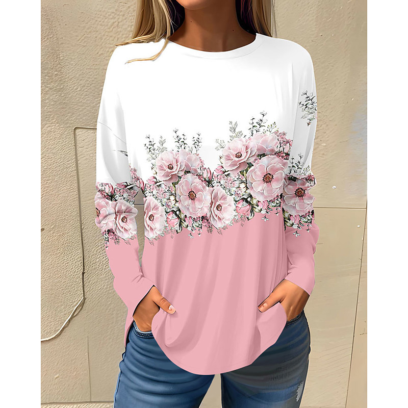 Women's T shirt Long Sleeve Basic Floral Print Long Sleeve Regular Tops Round Neck Holiday Weekend White Pink Red Navy Blue Blue Fall Winter Prefall