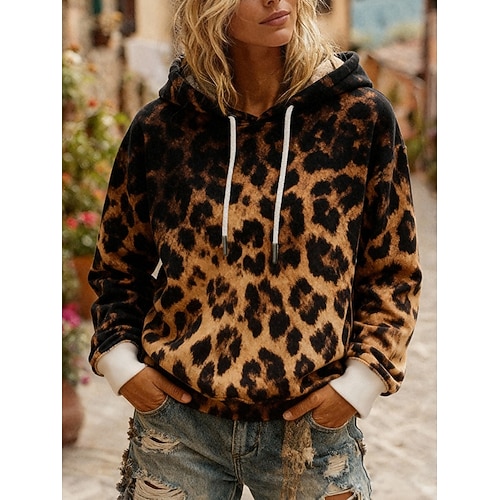 Per donna Pullover Felpe con cappuccio Leopardo Moda Streetwear Casual Manica Lunga Con Cappuccio Top Regolari Casuale Abbigliamento Quotidiano Coulisse Stampato Marrone Primavera Autunno