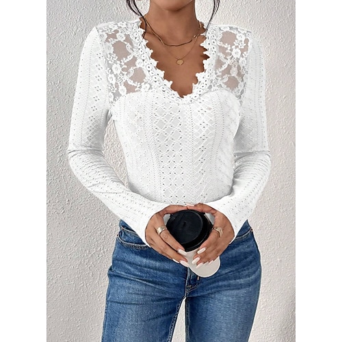 Per donna Top con cuciture in pizzo Tinta unica Elegante Moda Sexy Manica Lunga Scollo a V Top Regolari Quotidiano Uscire Weekend Pizzo Traforato Blu Nero Bianco Autunno Inverno