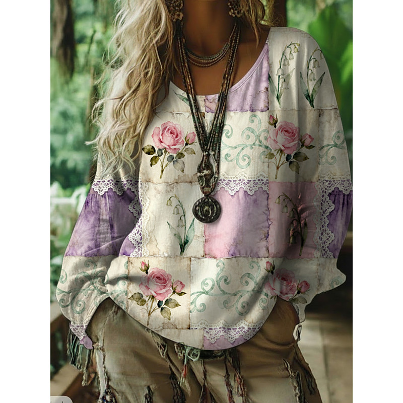 Women's Boho T-shirt T Shirt Tee Top Floral Vintage Ethnic Casual Long Sleeve Crew Neck Regular Tops Daily Weekend Vacation Wear Print Purple Summer Spring Fall