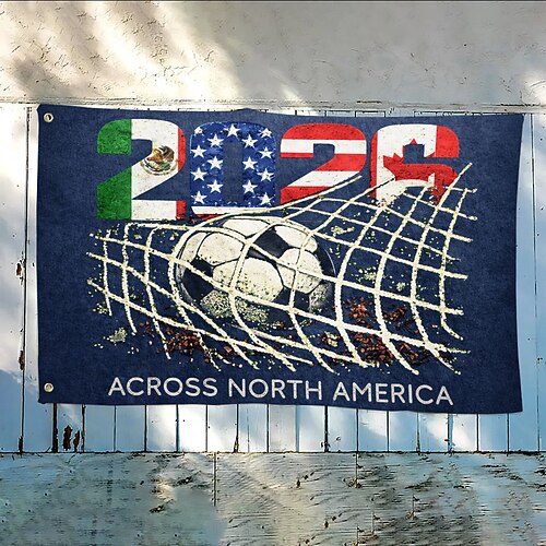 Bandiera a tema calcistico per il Nord America del 2026, con motivi della bandiera e un pallone da calcio in una rete, decorazione murale versatile per gli amanti dello sport.