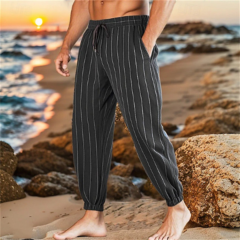 Men's Linen Pants Trousers Summer Pants Baggy Pants Elastic Waist Drawstring Straight Leg Striped Comfort Breathable Full Length Casual Daily Holiday Vacation Fashion Black White Inelastic