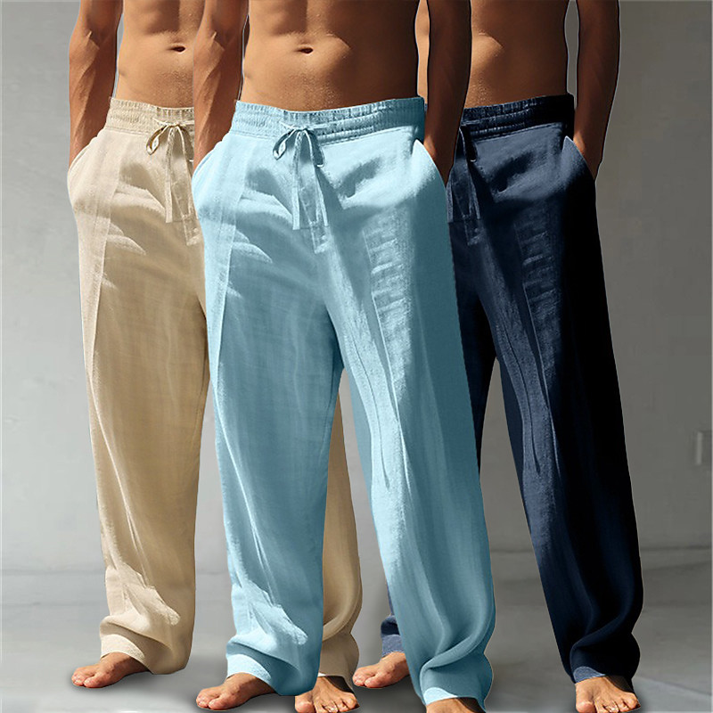 Men's Linen Pants Trousers Summer Pants Baggy Pants Beach Pants Drawstring Elastic Waist Solid Color Comfort Breathable Daily Outdoor Beach Vacation Fashion Light Khaki Black Inelastic