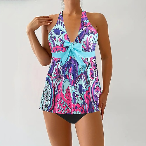Costume tankini 2 pezzi da donna che enfatizza il fondoschiena senza schienale abbigliamento da spiaggia per le vacanze floreale scollatura a U senza maniche costumi da bagno