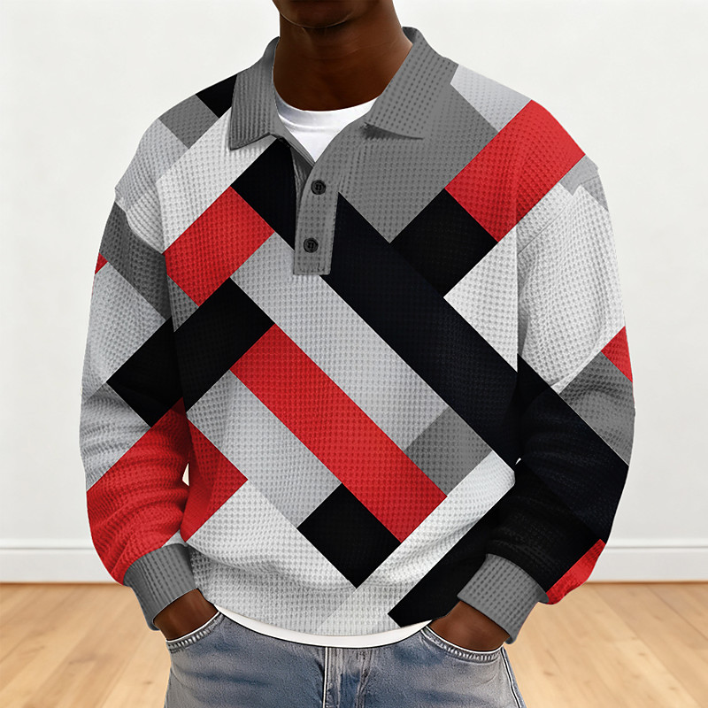 Men's Plaid Waffle Polo Shirts Golf Shirt Long Sleeve Polo Shirts Collared Shirts Vintage Casual Vacation Wear Formal Wear Festival Wear 3D Print Buttons Red Blue Purple