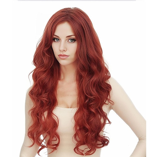 24 Zoll lange, kastanienbraune Perücke für Damen, lange kupferrote, gewellte Perücke, synthetische, natürlich ingwerfarbene Perücke für Cosplay, Halloween und den täglichen Gebrauch