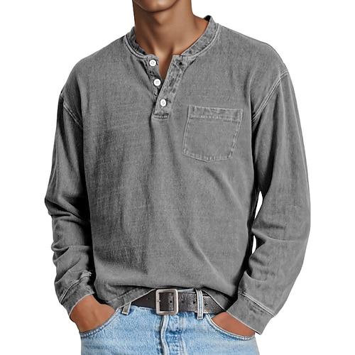 Per uomo Maglia Henley Camicia 100% cotone lavaggio acido Manica Lunga Henley Primavera Autunno Tutte le stagioni Tinta unica Vintage Retrò Vintage Casual Stile Vintage Lavato Casuale Blu chiaro Nero