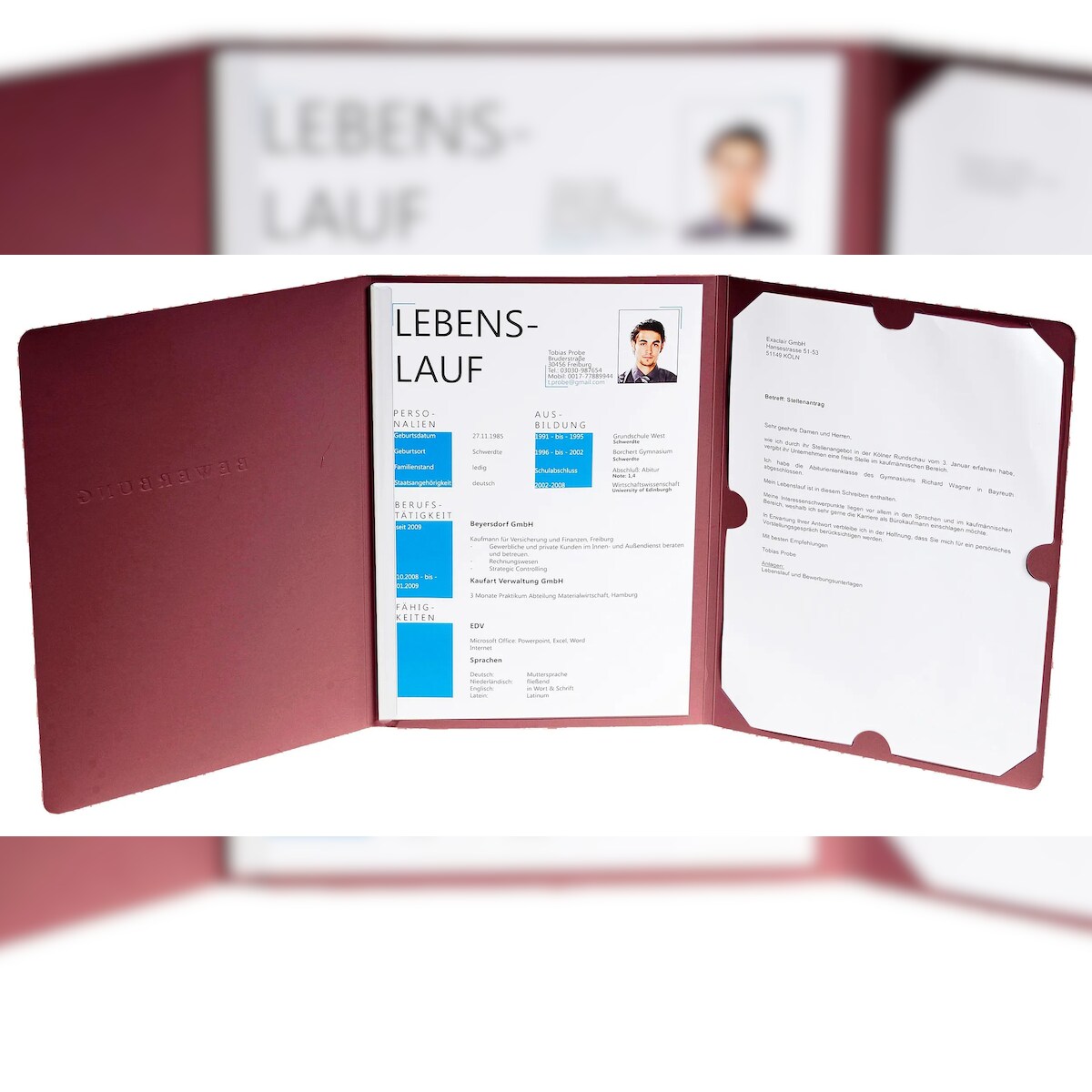 Exacompta 48608B 10x Bewerbungsmappe aus Colorspan-Karton 400g/qm mit Leinenoptik, Serie Elegance, 3-teilig mit 1 Klemmschiene, DIN A4 - Bordeauxrot