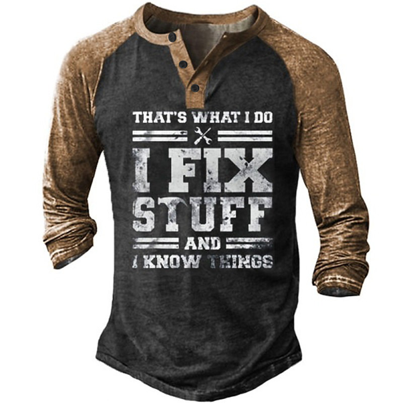 Mens Graphic Long Sleeve Henley Shirt: 'I Fix Stuff And I Know Things' - Raglan Design for Hobbies DIY Enthusiasts