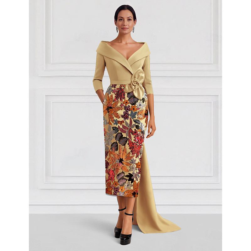 A-Line Floor Length Beaded Eembroidered Formal Dresses Mother of the Bride Dress Evening Gown Ball Gown with Overskirt Formal Dress Elegant Color Block High Split Half Sleeve Shirt Collar Wedding